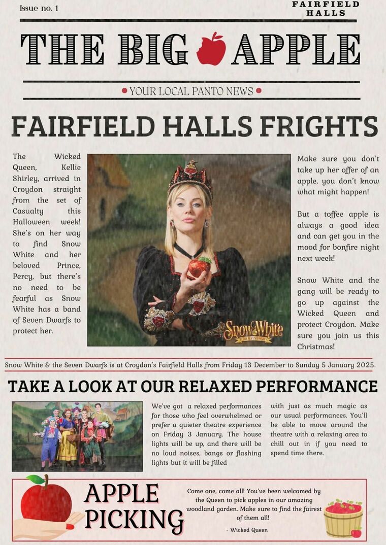 Take a read below of our brand new panto newspaper, The Big Apple. Our panto cast have been seen arriving in Croydon and this week is our spooky special. The Wicked Queen has landed in Croydon!