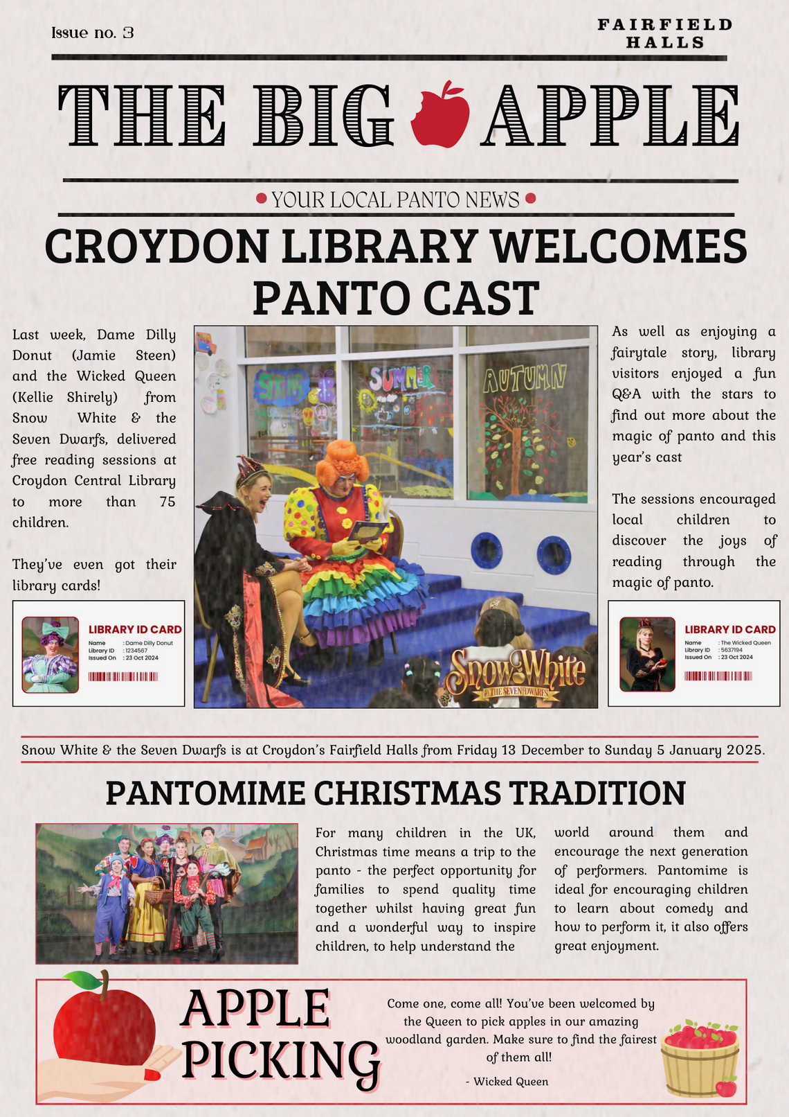 Take a read below of our brand new panto newspaper, The Big Apple. Dame Dilly Donut and the Wicked Queen made their way to Croydon Library for a Snow White storytime, they even got their very own library cards!