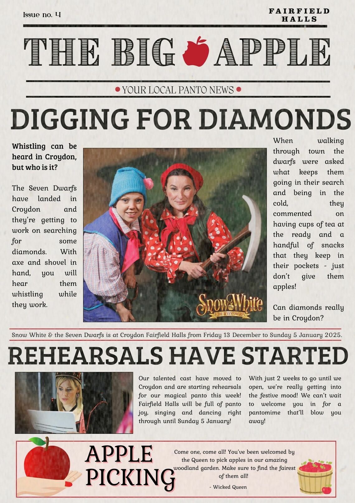 Our brand new panto newspaper, The Big Apple. Our panto cast have been seen arriving in Croydon and this week they've been seen digging for diamonds! Can Diamonds really be in Croydon?